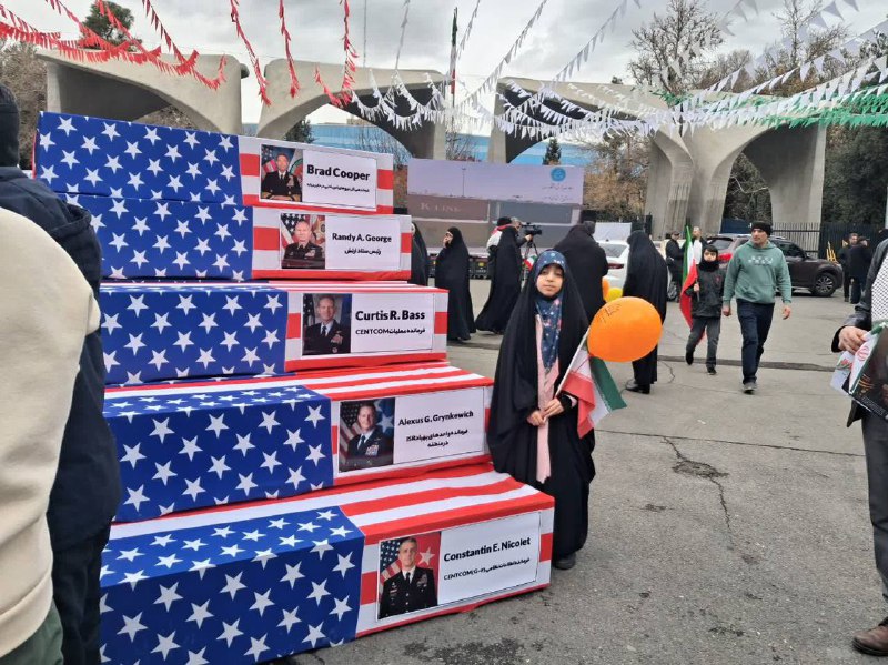 Coffins draped in U.S. flags and bearing pictures of senior commanders paraded at the 47th anniversary of the Islamic Revolution. Source: Behold Israel